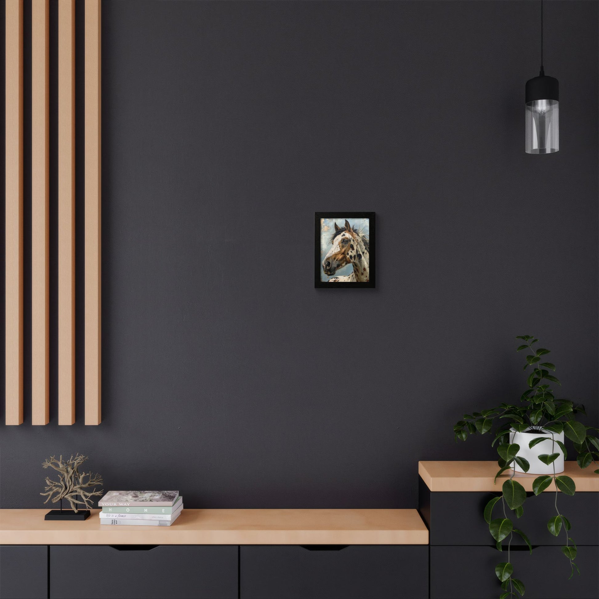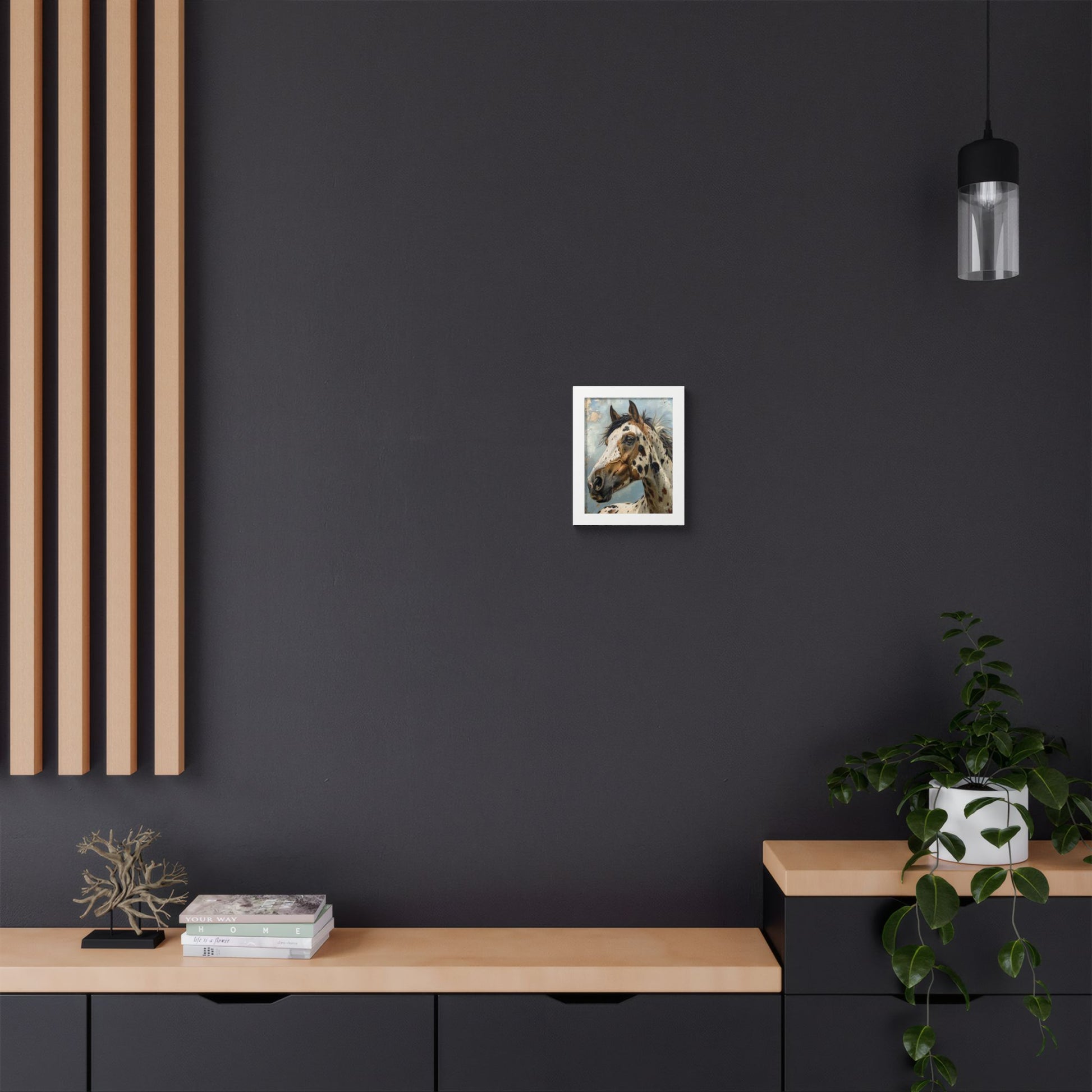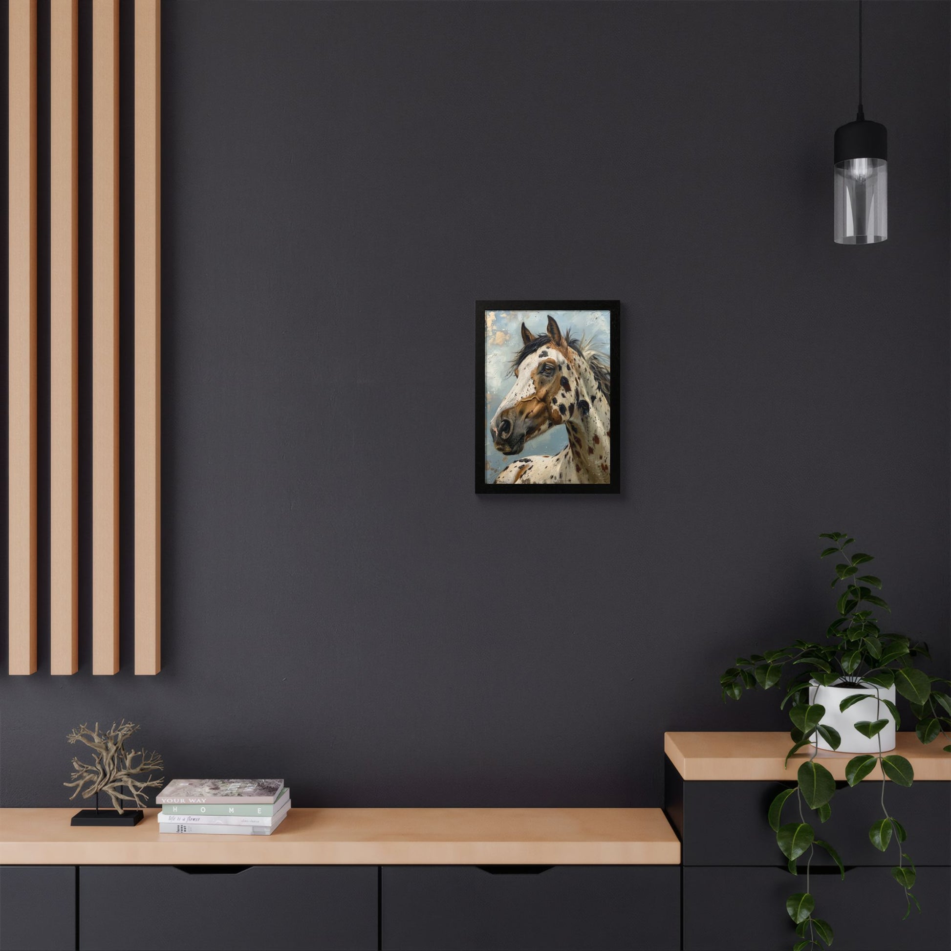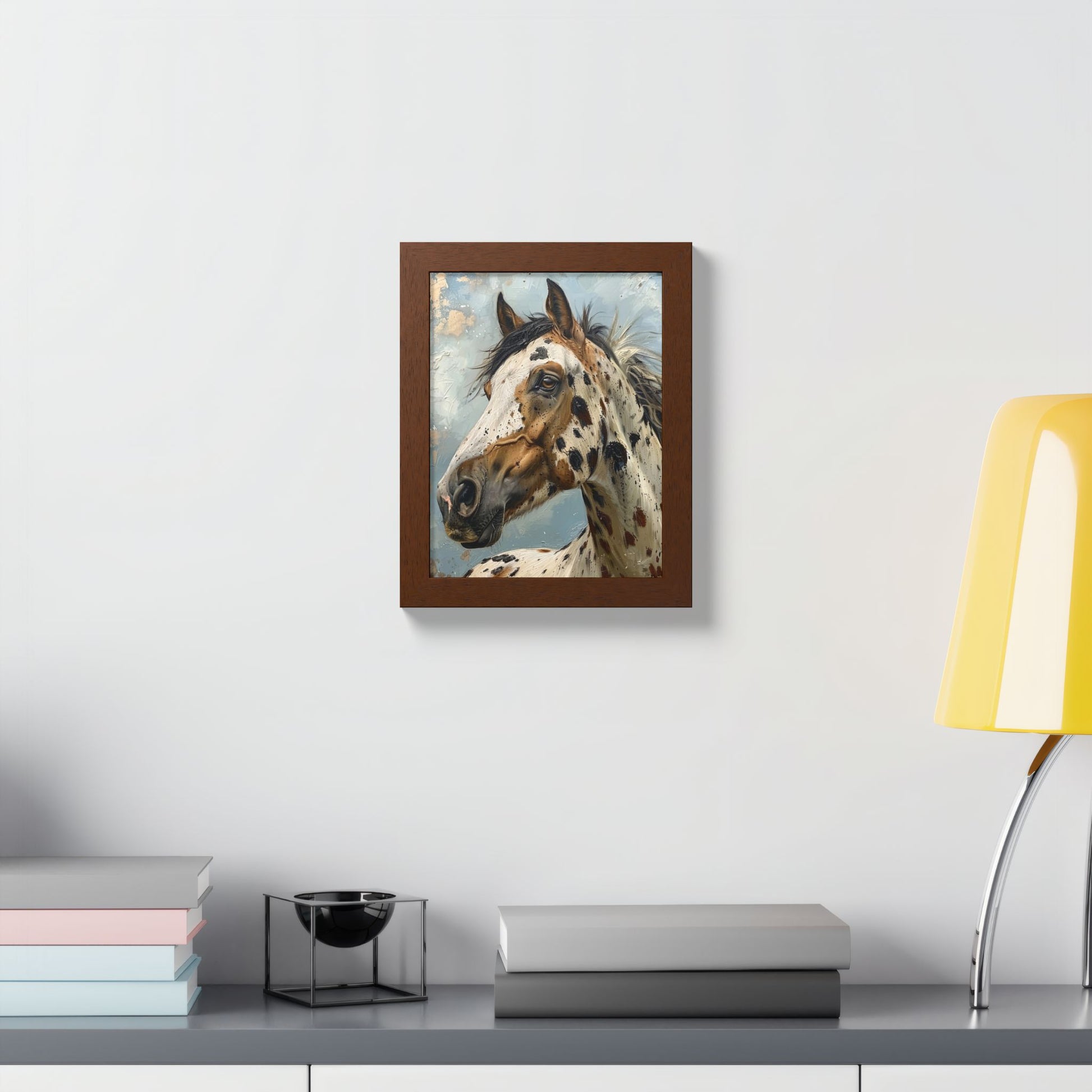 This framed poster brings a spirited equine portrait into any room — a striking, painterly Appaloosa captured in rich, multi-layered color. The warm wooden frame and semi-gloss print give depth to the brushlike textures and clouded sky behind the horse, making the image feel alive and present on the wall. Hung in an entryway, studio, or living room, it reads as both an art piece and a conversation starter. The included Perspex cover keeps the surface clear and protected, while the ready-to-hang hardware means you can display it right away.