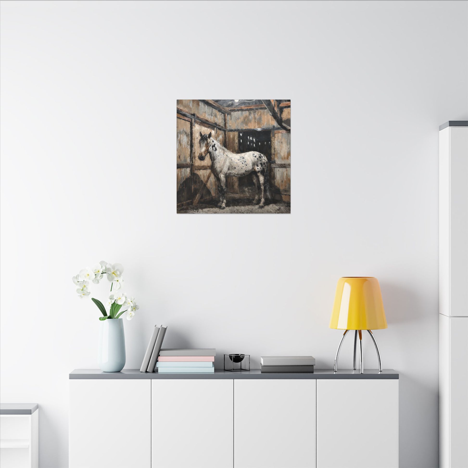 A hand-stretched matte canvas print that brings quiet stable-side charm into your home. The painting-style image of an Appaloosa standing in a weathered barn captures soft, earthy tones and painterly brushwork—warm browns, cream, and muted blacks—rendered with a velvety, non-reflective finish. Lightweight yet sturdy, the 0.75" depth canvas sits slightly proud from the wall, showing texture and depth while staying visually gentle. Built on responsibly sourced radiata pine and printed with low-emission, UL-certified Greenguard Gold inks, this piece feels like a timeless find you can live with for years. The subtle rubber feet on the back help keep it steady on the wall, and the durable cotton/poly canvas holds rich color without glare. Place it above a mantel, in an entryway, or near a reading nook to add a quiet, equestrian mood to everyday life.