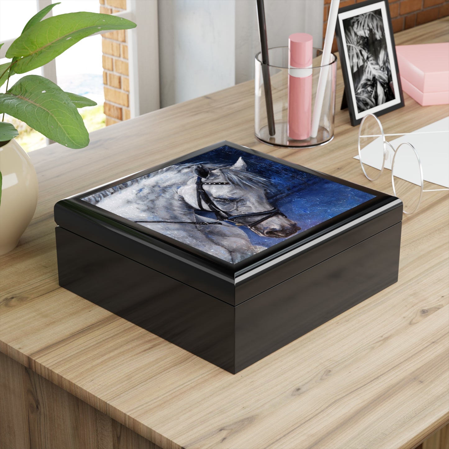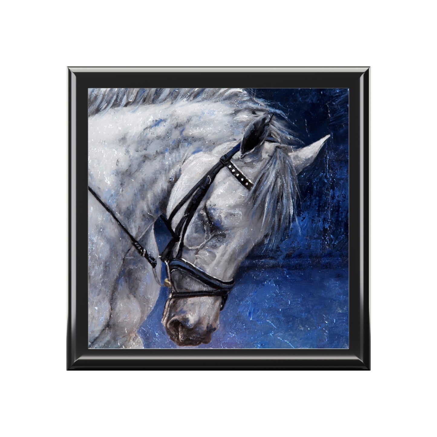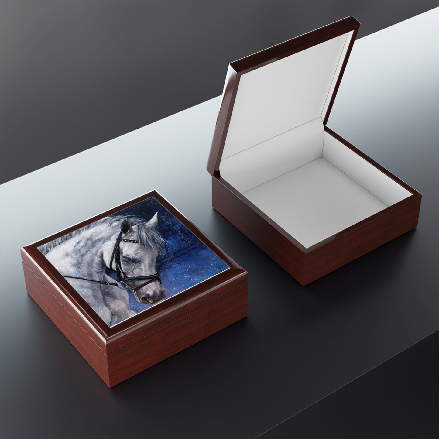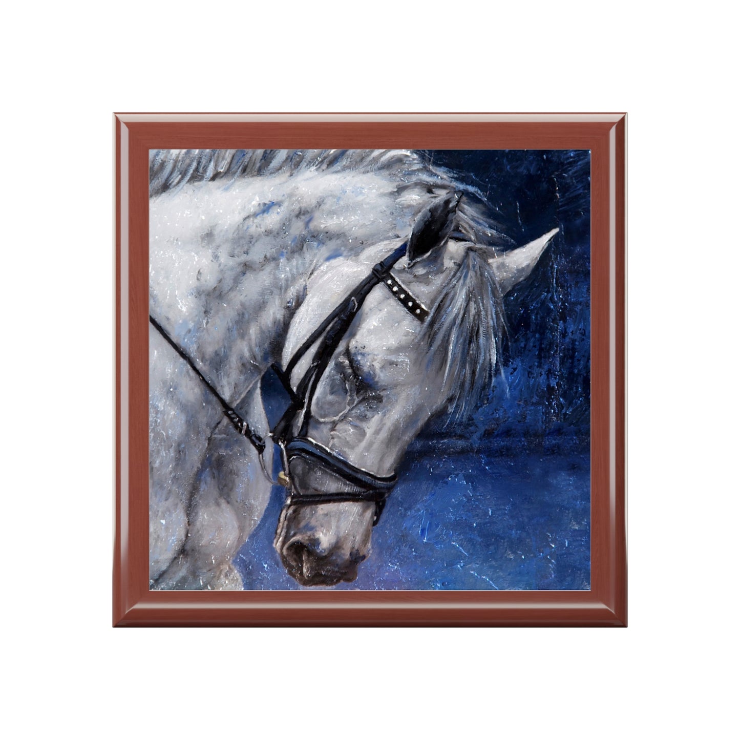 This jewelry box is the perfect place to store your treasured memories. Crafted from wood and adorned with a grey horse, it's a beautiful and timeless piece you can enjoy for years to come. The keepsake box provides ample storage and is sure to be a conversation piece.