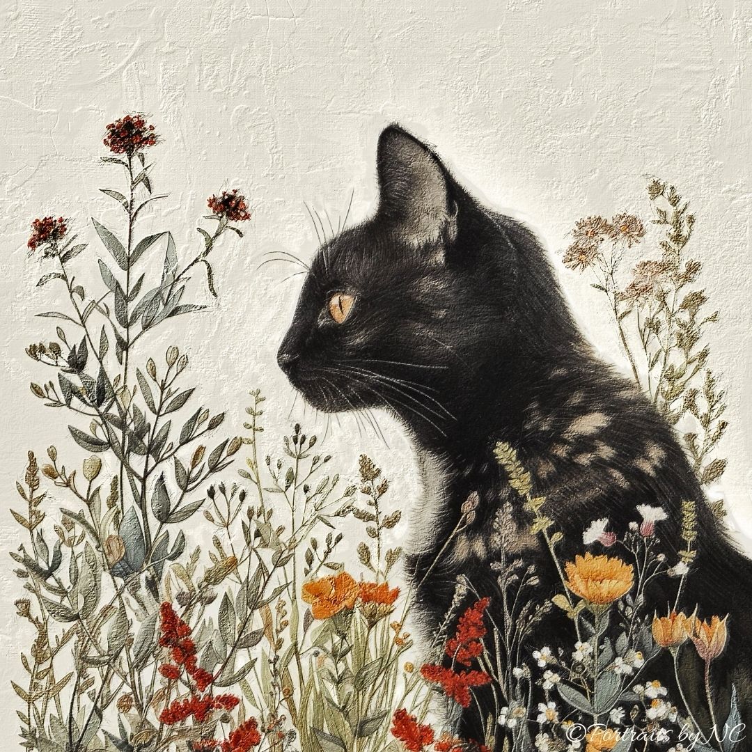 Black Cat in Flower Field Pet Portrait Oil Portraits