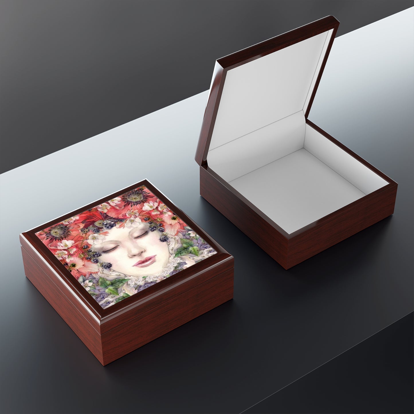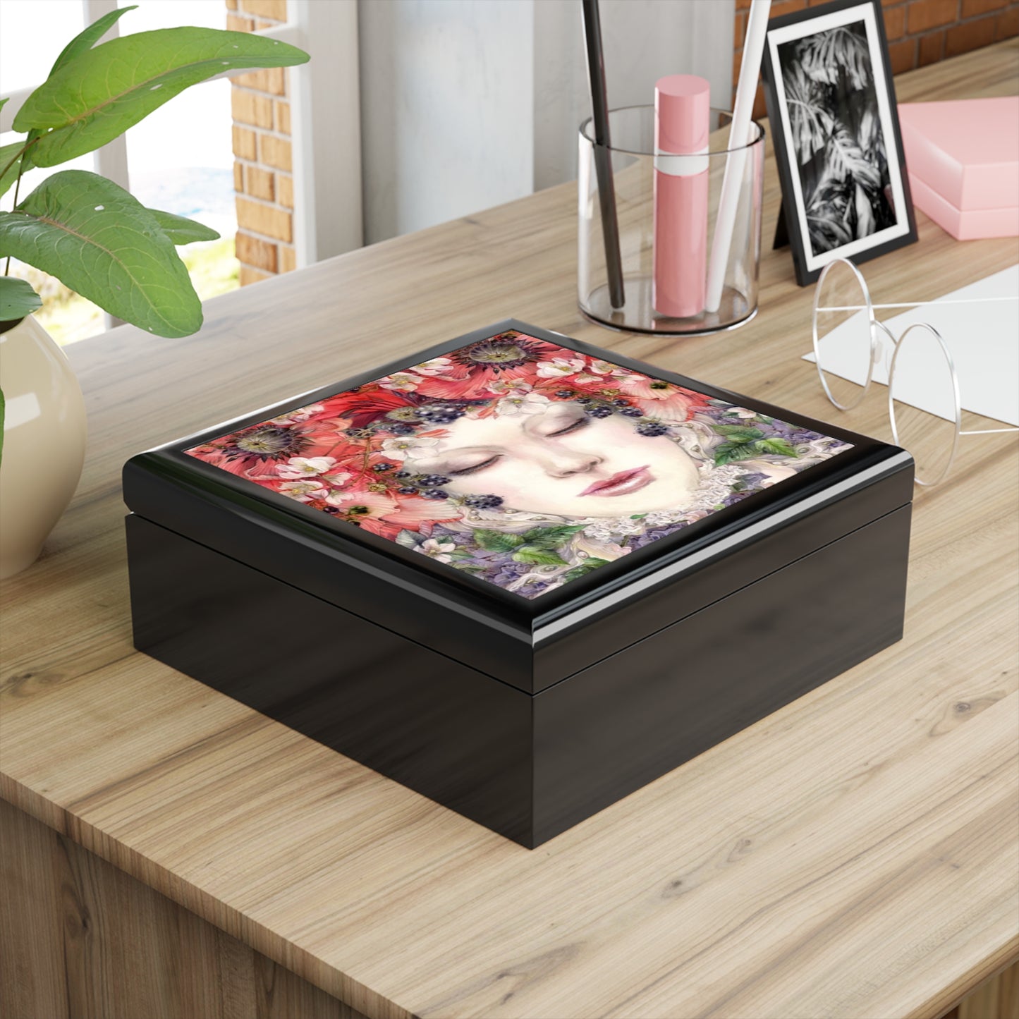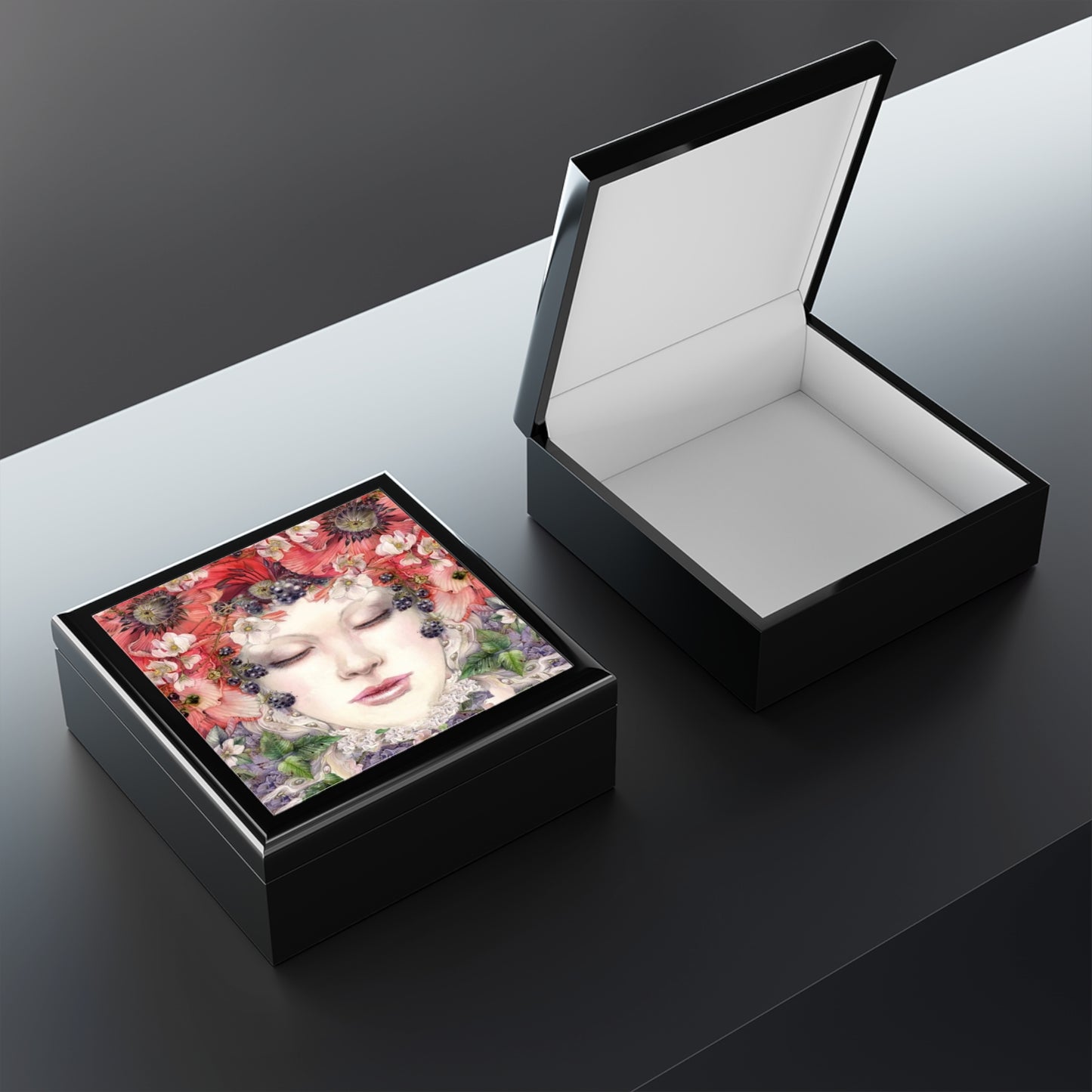 Treat yourself or a loved one to this beautiful Poppy Fairy lacquered jewelry box. Crafted with a glossy finish, this eye-catching box features a Poppy Fairy design and can store trinkets and accessories in style. Perfect for any jewelry collection.