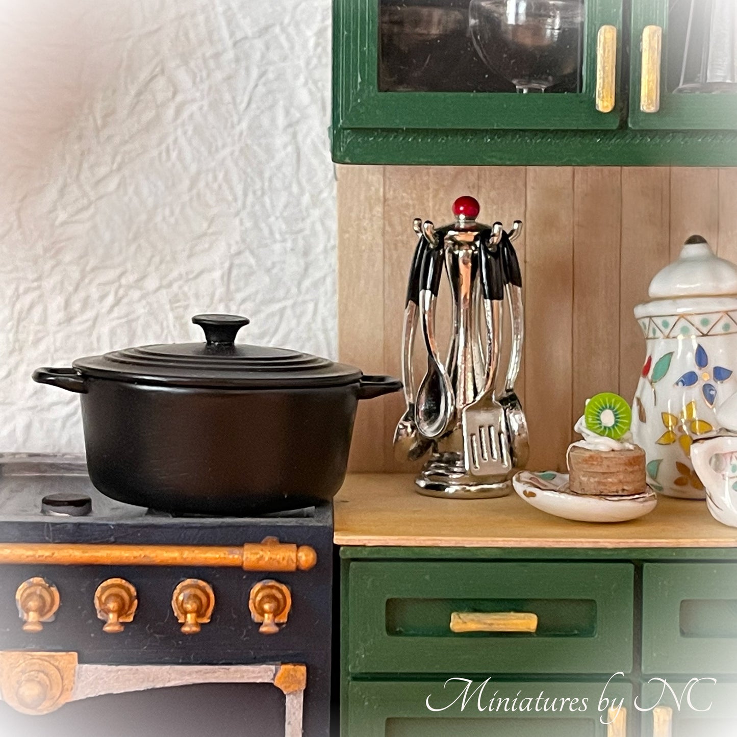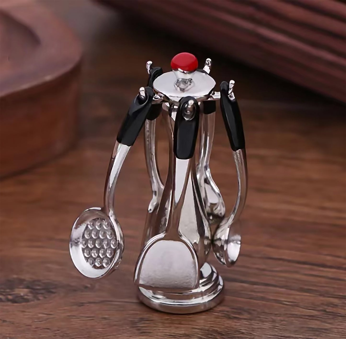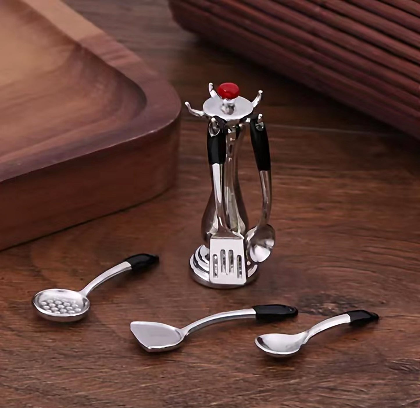 Every little kitchen diorama needs a set of kitchen utensils. Out chrome utensils hang on a free-standing stand, which adds realism to the display. Each utensil can be removed from the stand.