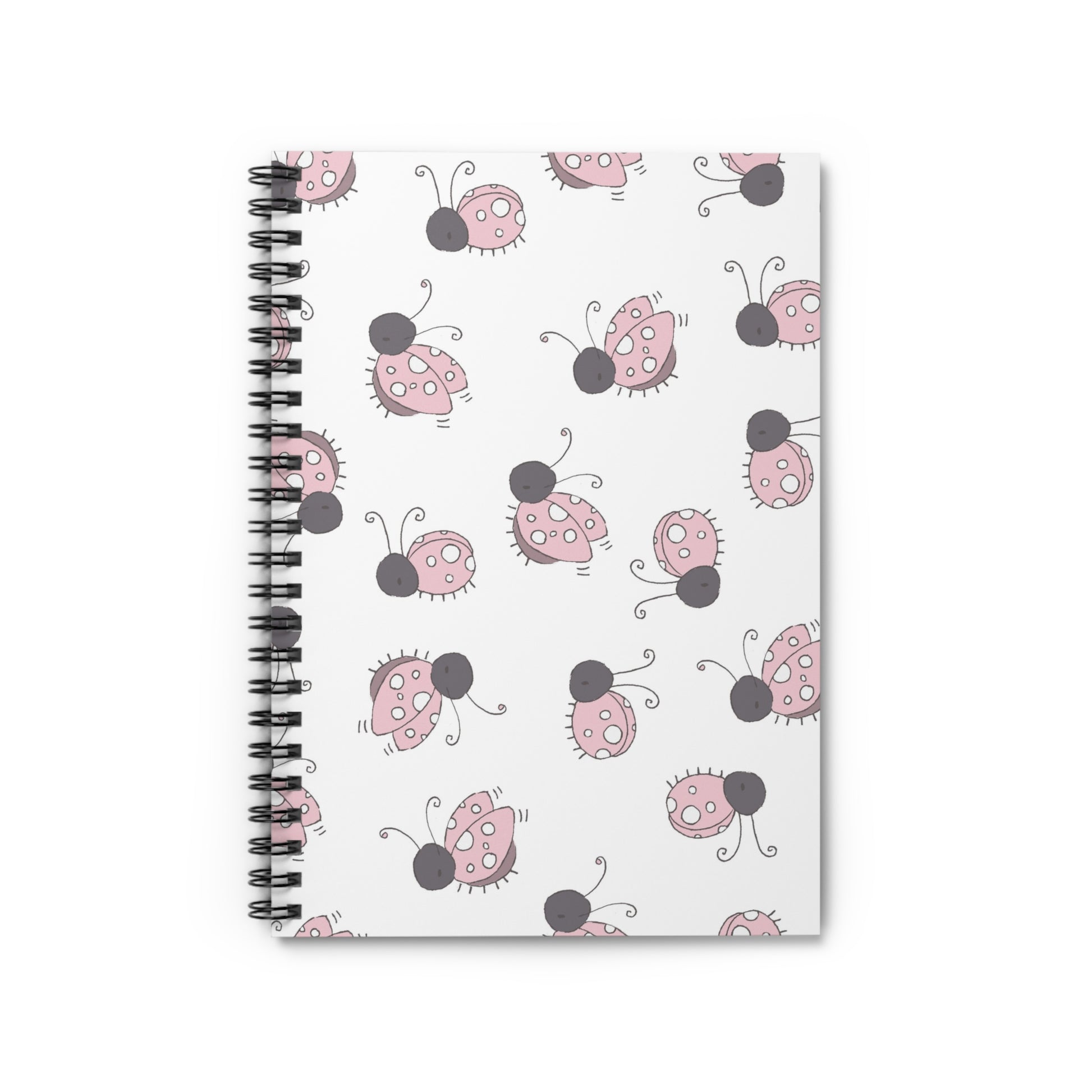 This 6" x 8" spiral notebook brings a soft, playful charm to everyday notes. Lightweight and neatly sized, it slips into a tote or backpack for quick sketches, to-do lists, or class notes. The front cover features a hand-drawn pattern of blush-pink ladybugs on a clean white field, giving the notebook a sweet, whimsical personality. Inside, 118 ruled pages of smooth 90 gsm paper make handwriting glide without feathering. A sturdy metal spiral lets the notebook lie flat or fold back for comfortable one-handed writing, and the inner document pocket keeps receipts, stickers, or loose notes organized. The dark grey back cover adds a subtle contrast and durability so this little companion wears well over time.