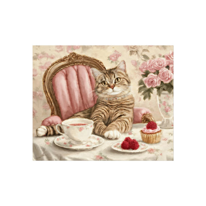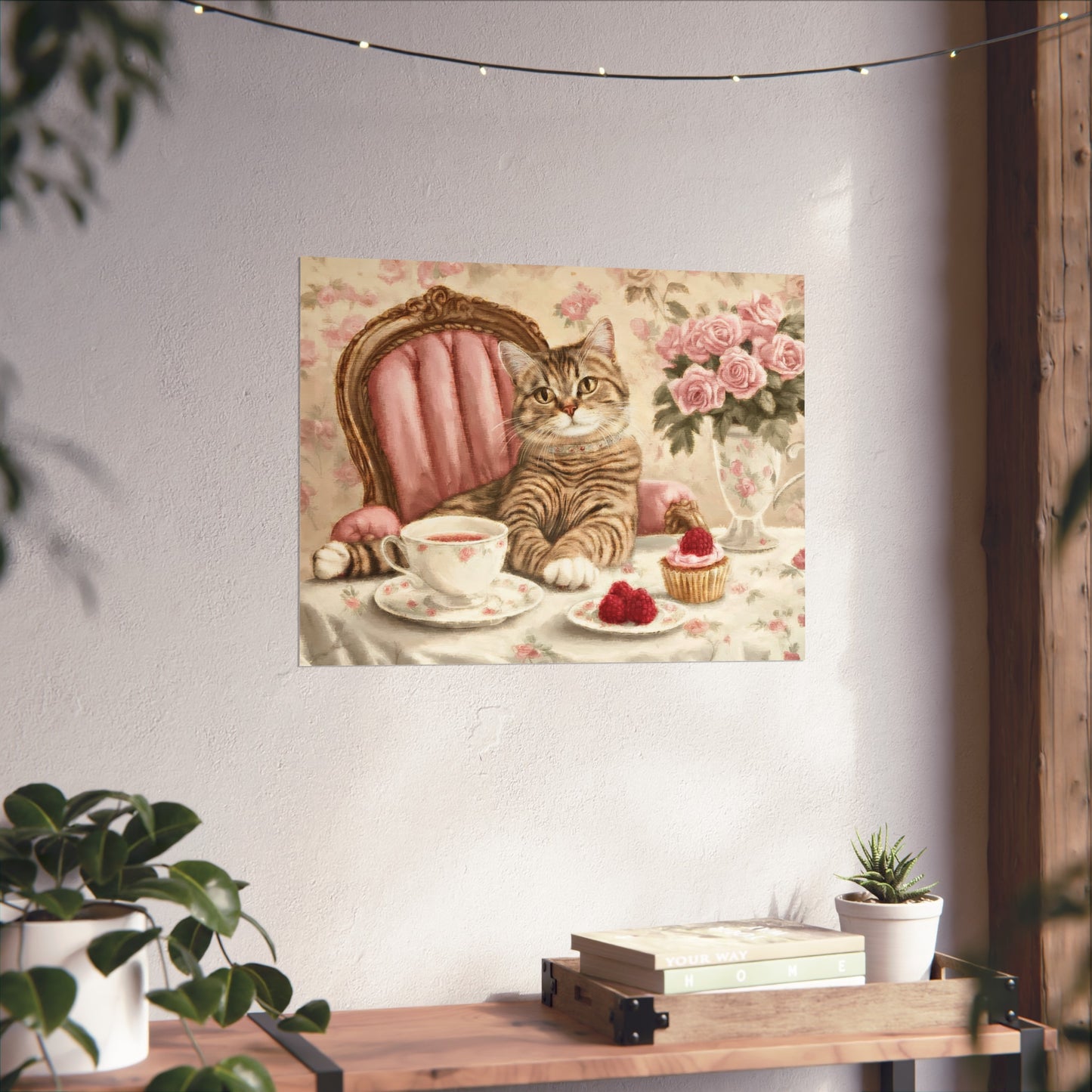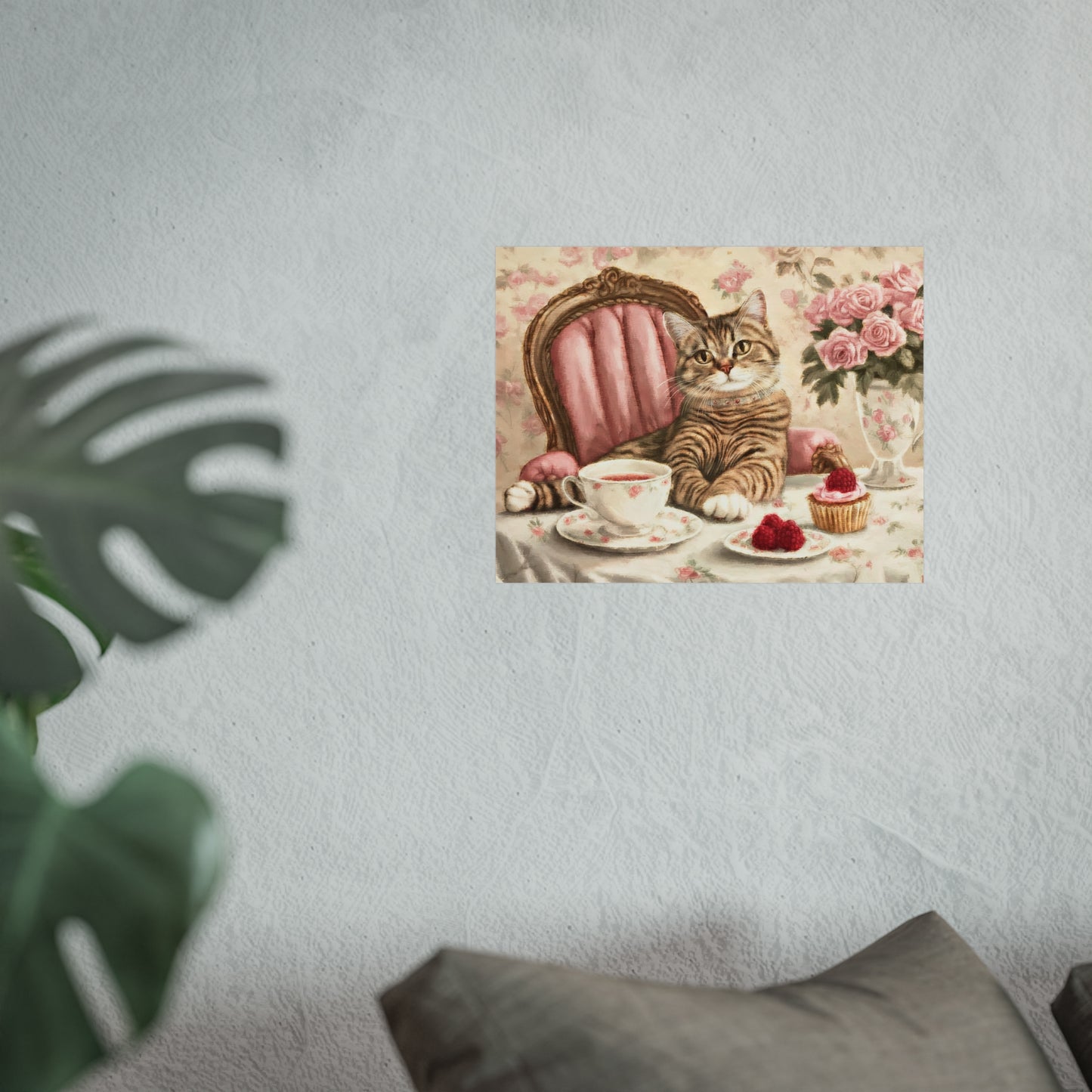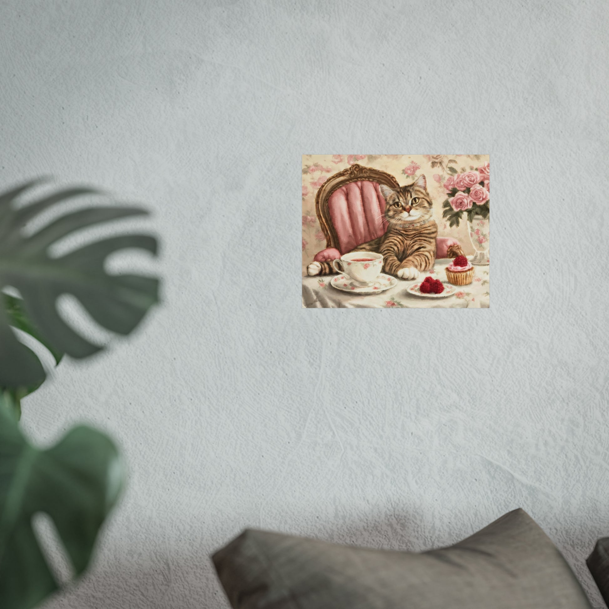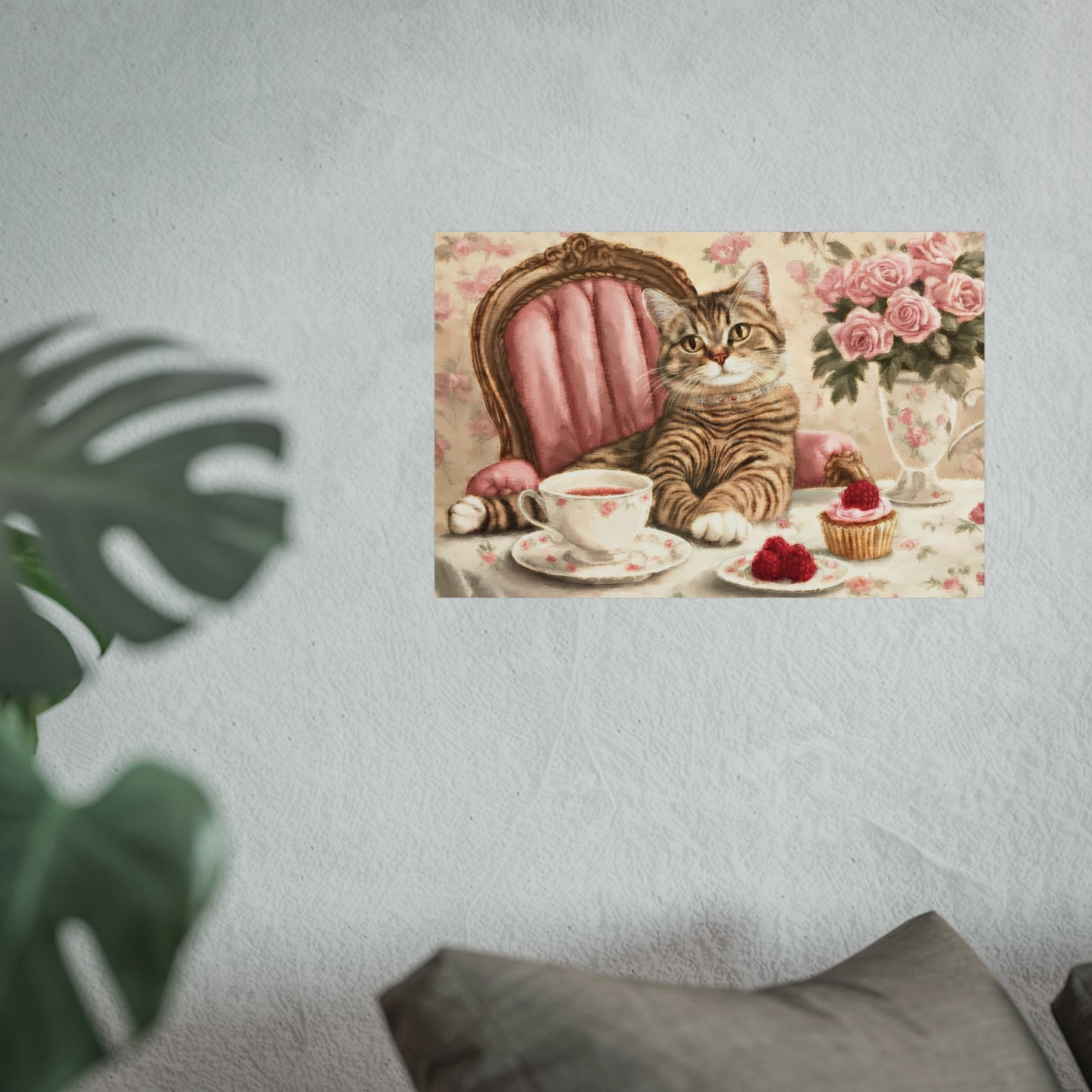 This cute tabby cat poster features the feline friend seated at a table set for tea time, giving off a romantic vibe. Perfect for cat lovers and those who enjoy whimsical decor, this poster can add a touch of charm to any room. Ideal for cat-themed parties, tea parties, or simply as a fun addition to a cozy space.
