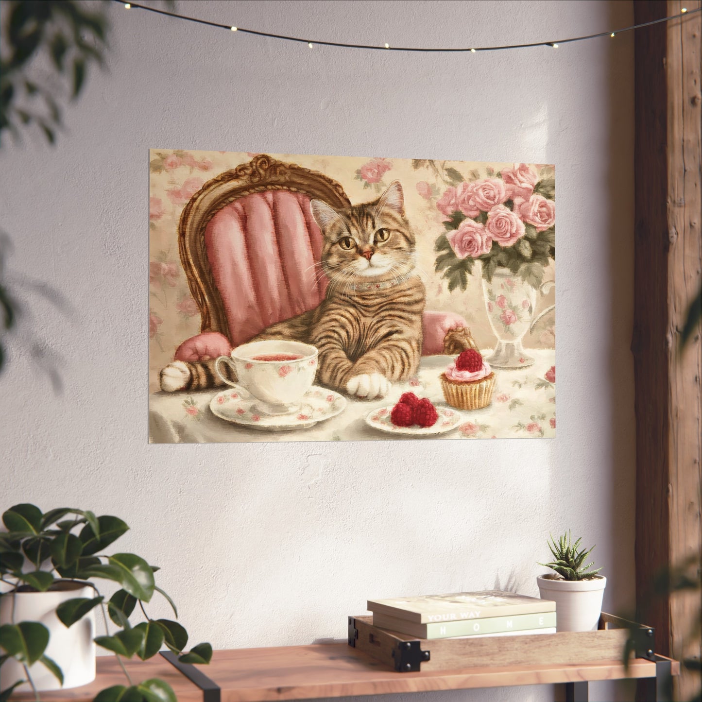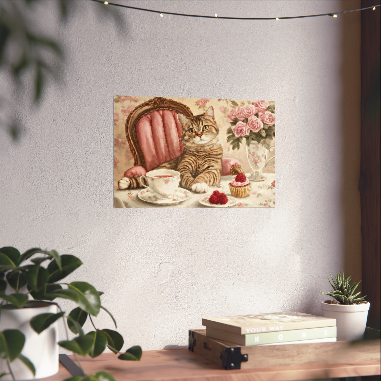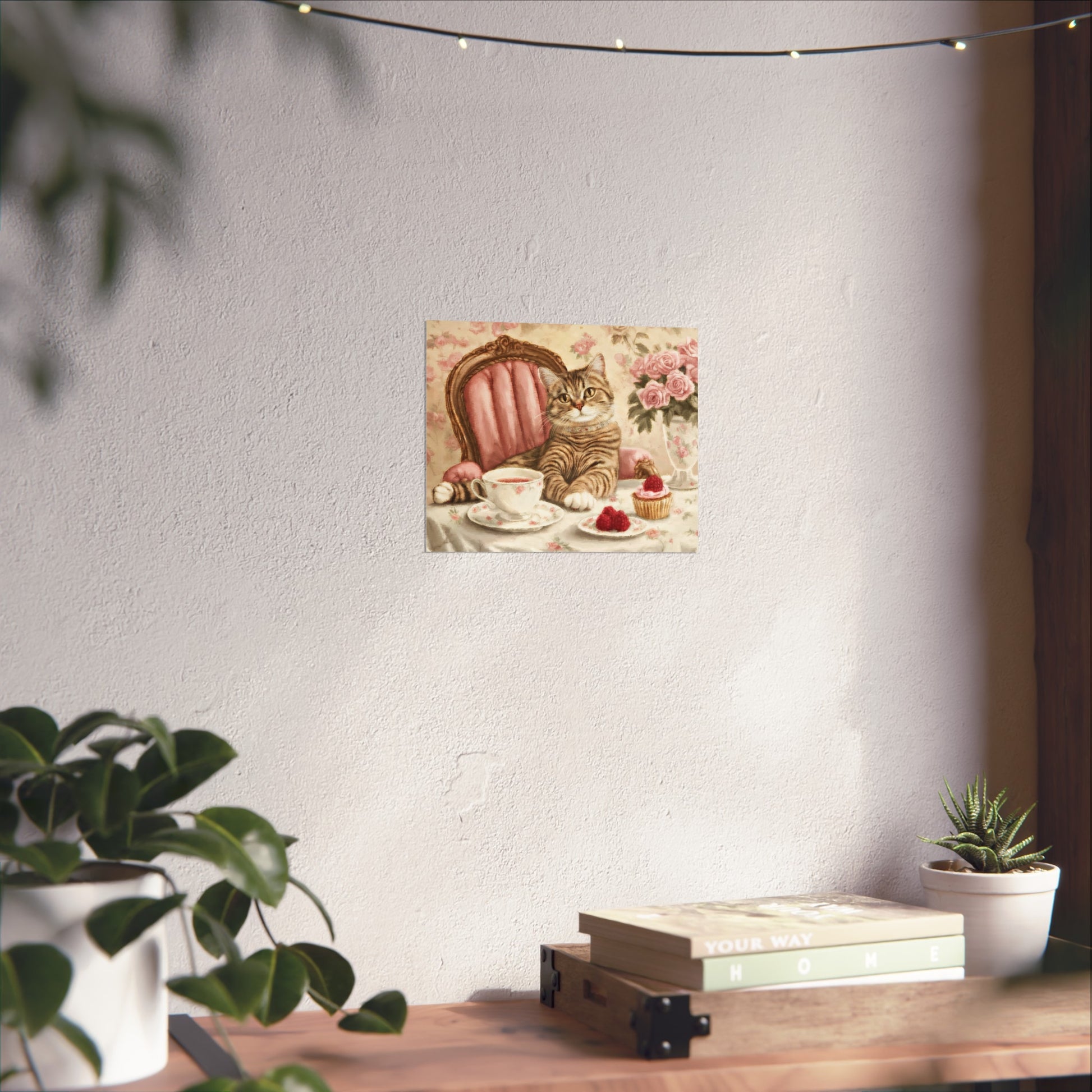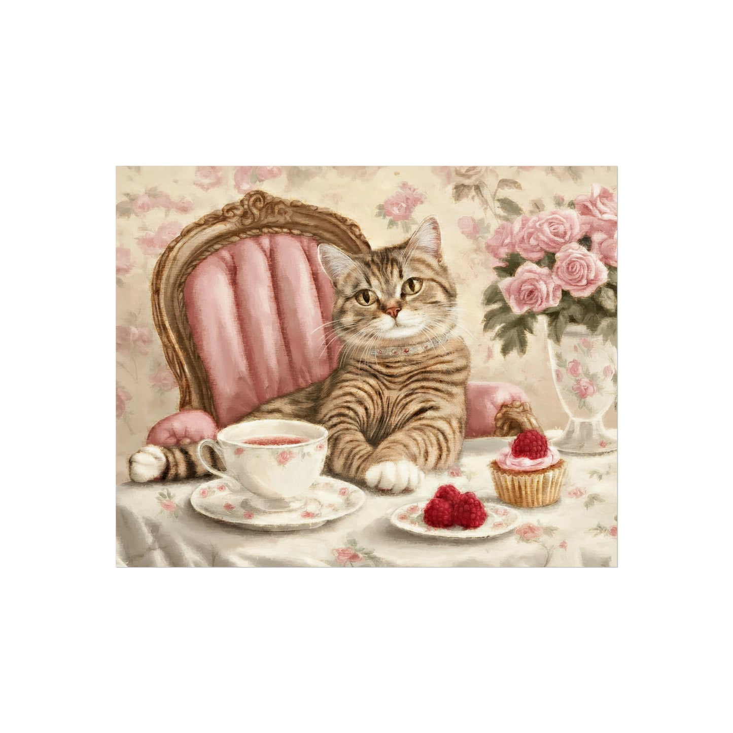 This cute tabby cat poster features the feline friend seated at a table set for tea time, giving off a romantic vibe. Perfect for cat lovers and those who enjoy whimsical decor, this poster can add a touch of charm to any room. Ideal for cat-themed parties, tea parties, or simply as a fun addition to a cozy space.