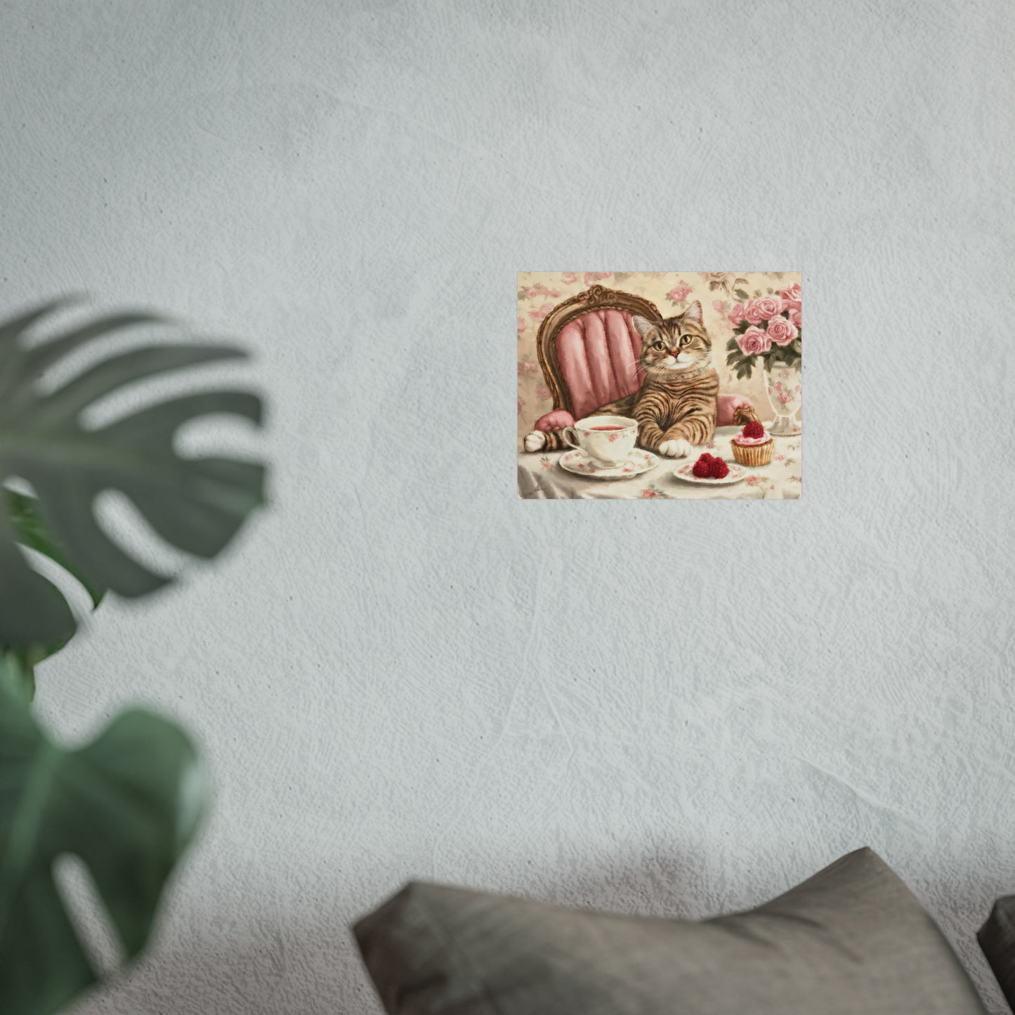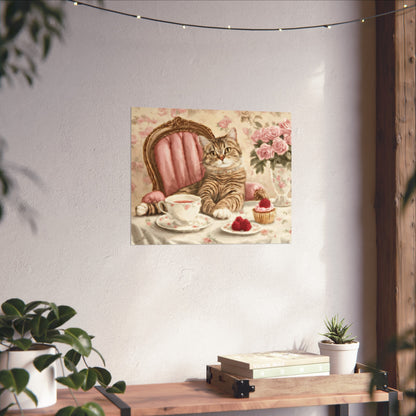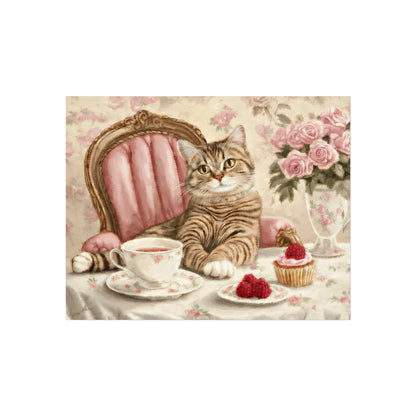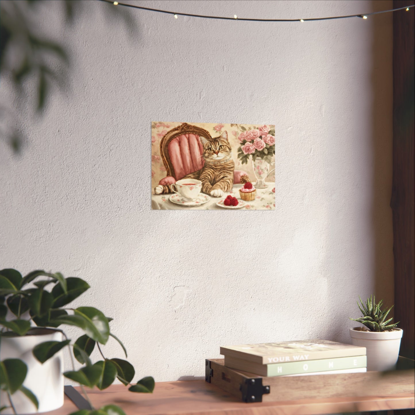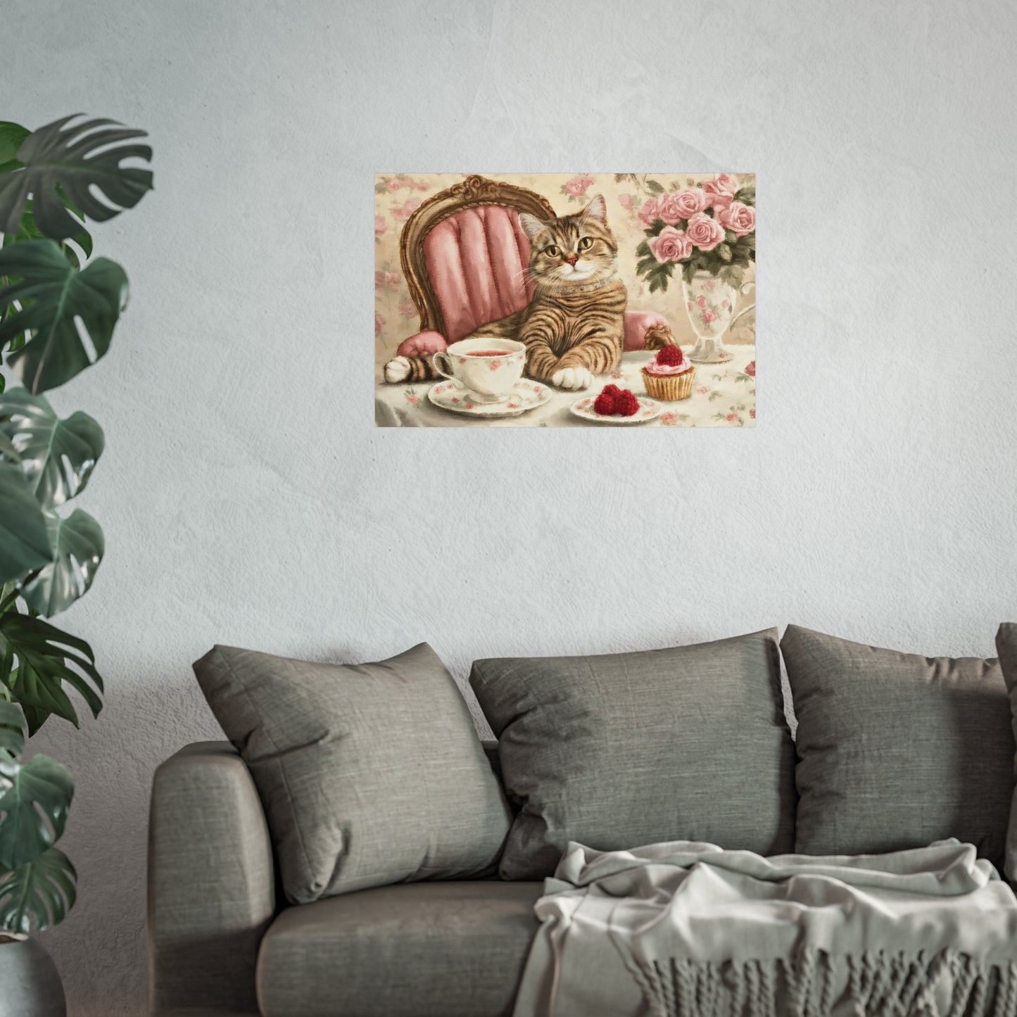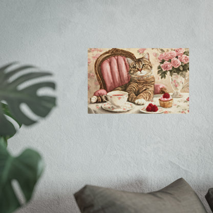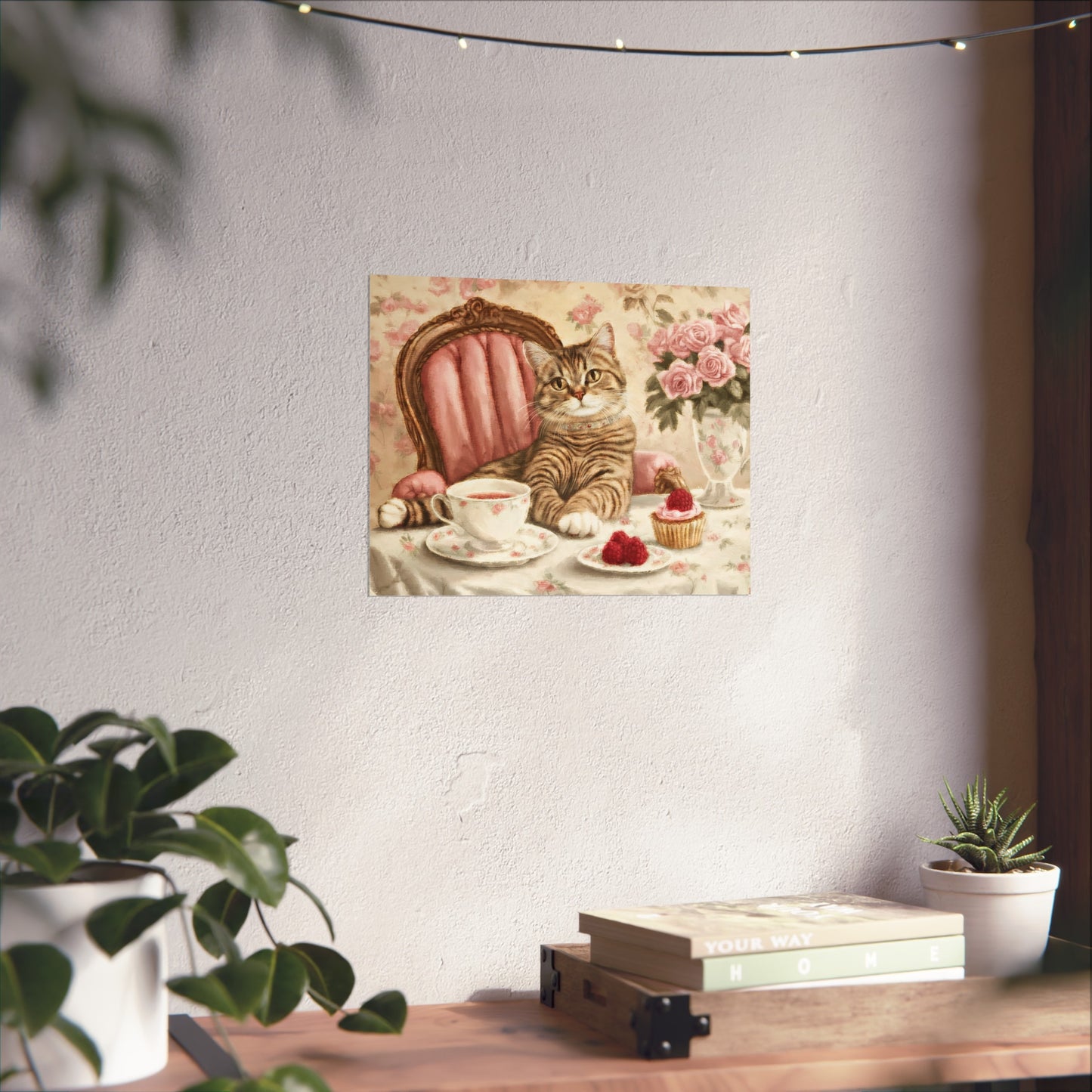 This cute tabby cat poster features the feline friend seated at a table set for tea time, giving off a romantic vibe. Perfect for cat lovers and those who enjoy whimsical decor, this poster can add a touch of charm to any room. Ideal for cat-themed parties, tea parties, or simply as a fun addition to a cozy space.