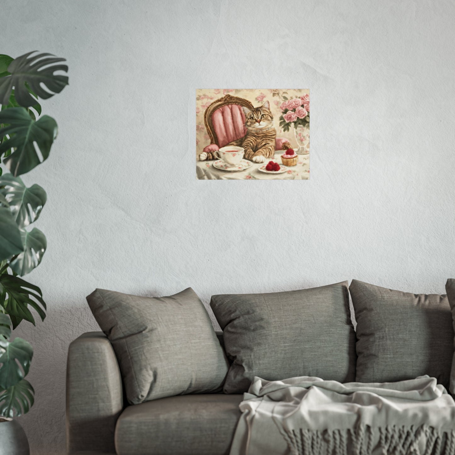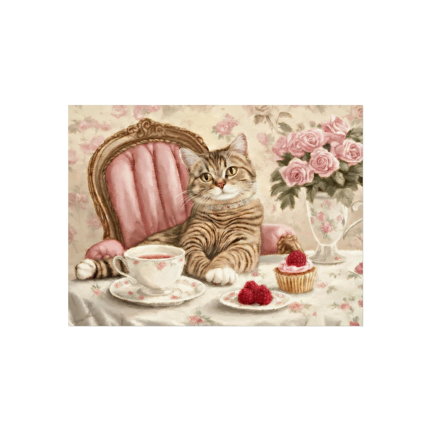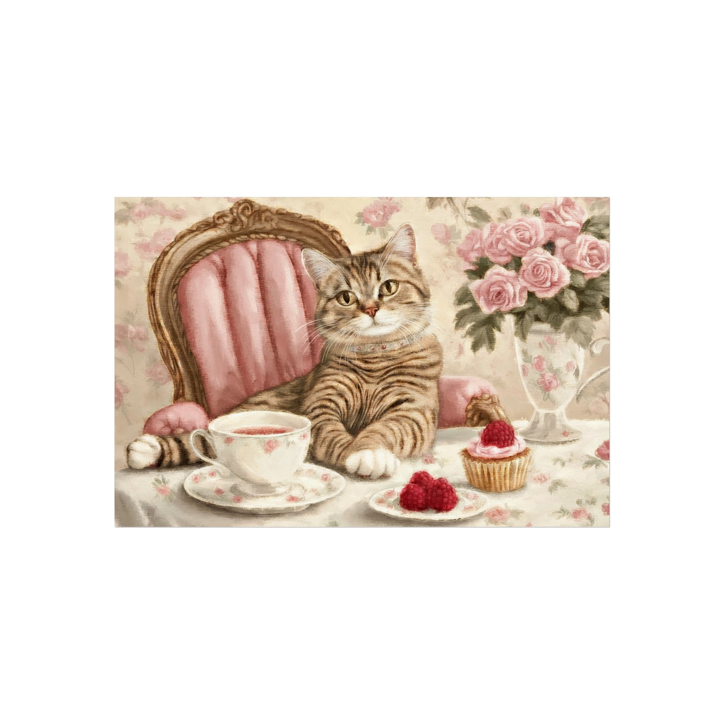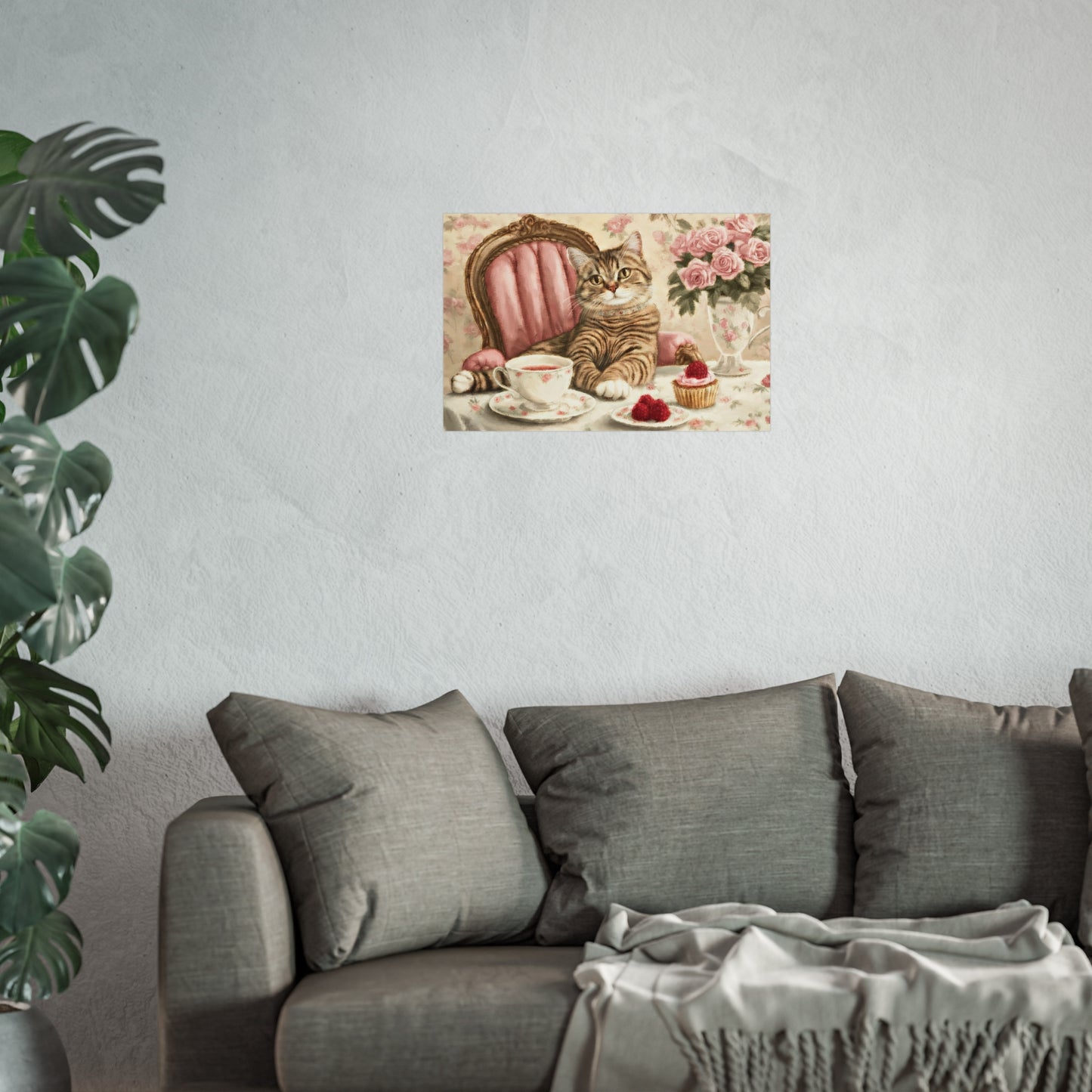 This cute tabby cat poster features the feline friend seated at a table set for tea time, giving off a romantic vibe. Perfect for cat lovers and those who enjoy whimsical decor, this poster can add a touch of charm to any room. Ideal for cat-themed parties, tea parties, or simply as a fun addition to a cozy space.